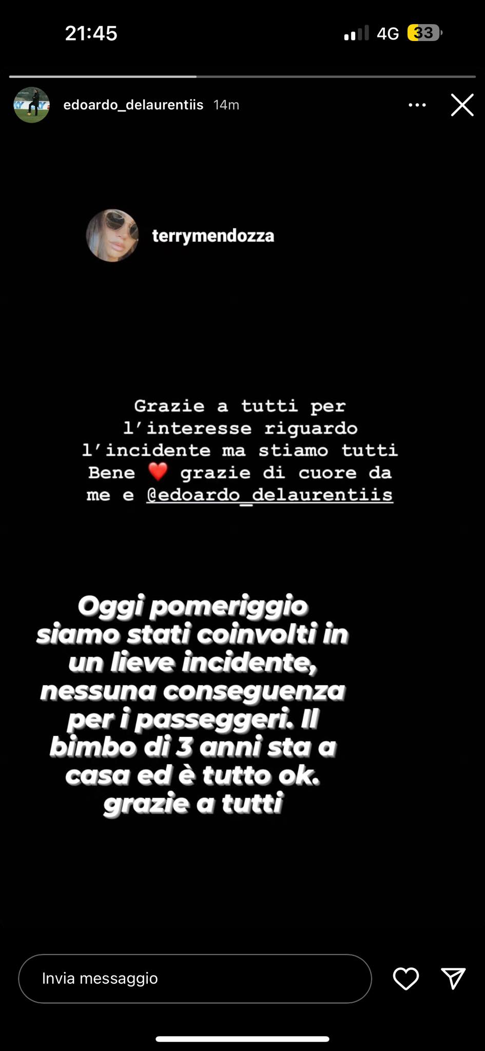 Edo De Laurentiis rassicura: "Coinvolti in un lieve incidente, il bimbo di 3 anni sta a casa ed è tutto ok"