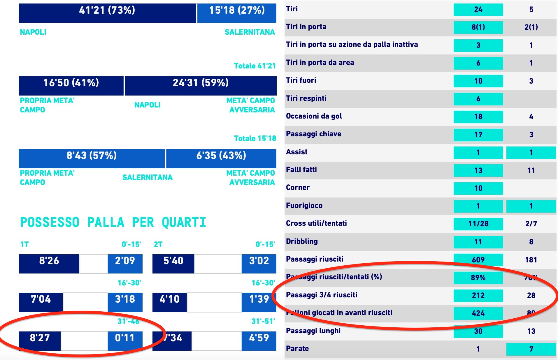 DATI DA ANTI-CALCIO - La Salernitana pur essendo in un ottimo momento di forma è stata totalmente annullata. Al di là dei 609 passaggi completati contro 181, fanno impressione gli appena 28 i palloni giocati nella 3/4 del Napoli, quasi tutti lanci lunghi al massimo sfiorati dagli attaccanti, contro i 212 dei partenopei. Per quanto riguarda il possesso: al di là del 73% finale per il Napoli, dal 30' al 45' la Lega ha registrato 8 minuti e 27 secondi contro 11 secondi della Salernitana (foto di seguito). Un dato che è introvabile persino contro squadre di categoria inferiore. Tutto questo è servito in fase difensiva? No, perché il Napoli ha avuto comunque le sue occasioni (sprecandole). La Salernitana ha pareggiato perché il calcio è imprevedibile ed episodico, e lo amiamo per questo, ma bisogna esserne consapevoli e non partire dal risultato casuale per dare meriti a chi è stato in balìa per tutta la gara.