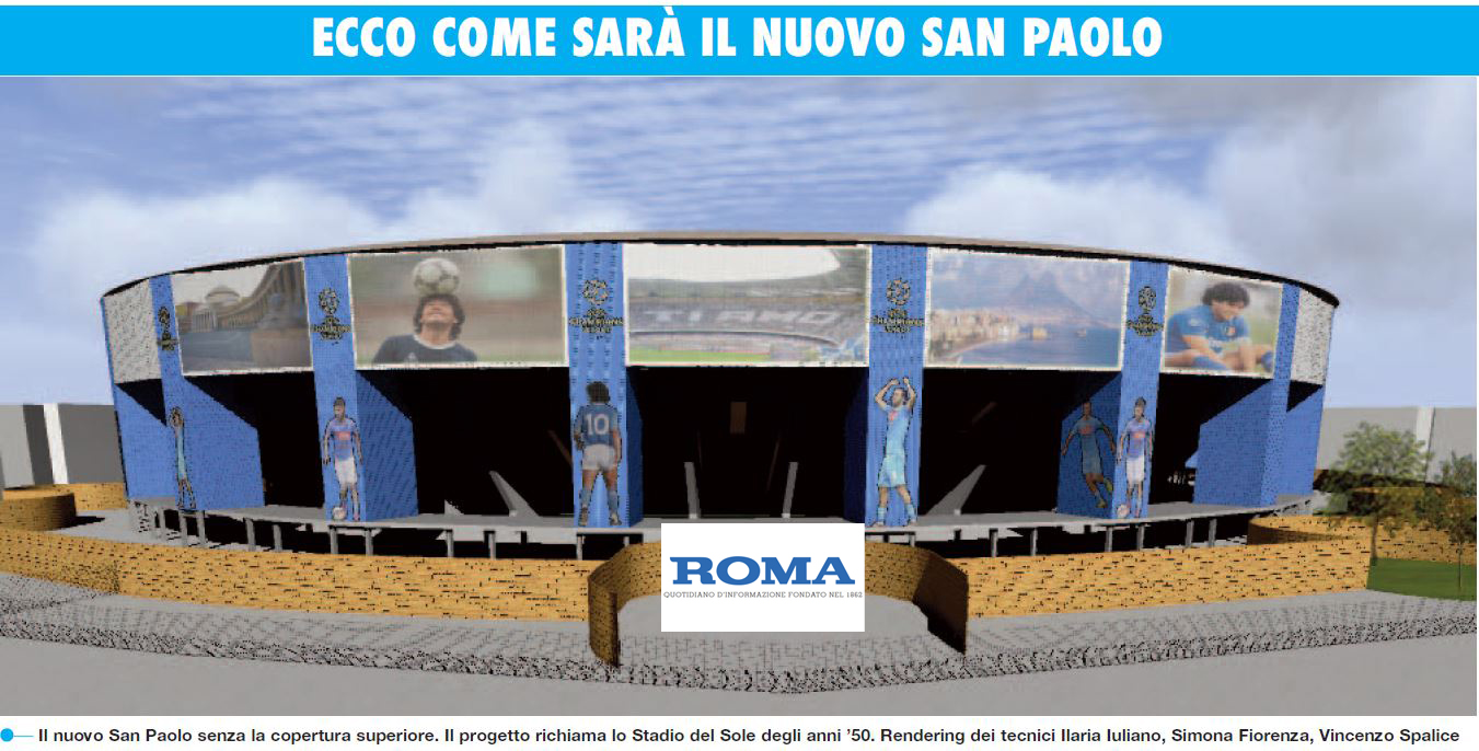 IL TEAM. Il progetto preliminare del nuovo San Paolo è stato realizzato dal gruppo di progettazione guidato dal direttore centrale Infrastrutture del Comune di Napoli, l’ingegner Andrea Esposito, responsabile del procedimento l’architetto Aniello Napolitano, mentre del gruppo di progettazione fanno parte l’istruttore tecnico Aniello Manzo, il geometra Domenico Menniti, l’istruttore tecnico Salvatore Riccardi, il funzionario geometra Aldo Siniscalco, il funzionario Ingegnere Nicola Speranza. A completare la squadra i collaboratori edili architetti Simona Fiorenza e Ilaria Iuliano e l’ingegnere Vincenzo Spalice, giovani tirocinanti del progetto Garanzia Giovani e autori delle immagini renderizzate che corredano il programma presentato al Credito Sportivo e che ci consentono di ammirare lo stadio come sarà in futuro.