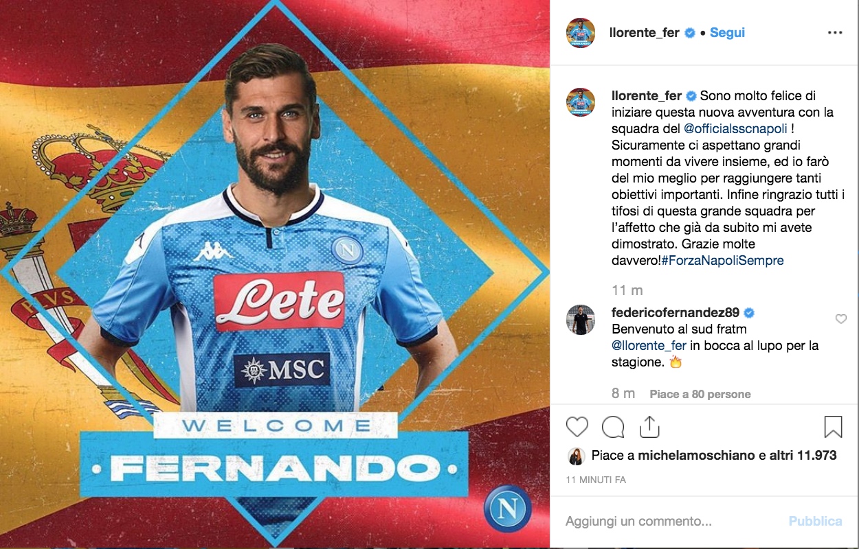 Prime parole da calciatore del Napoli per Fernando Llorente. L'attaccante scrive un post su Instagram per salutare i suoi nuovi tifosi: "Sono molto felice di iniziare questa nuova avventura con la squadra del Napoli! Sicuramente ci aspettano grandi momenti da vivere insieme, ed io farò del mio meglio per raggiungere tanti obiettivi importanti. Infine ringrazio tutti i tifosi di questa grande squadra per l’affetto che già da subito mi avete dimostrato. Grazie molte davvero!