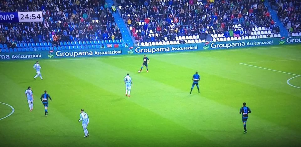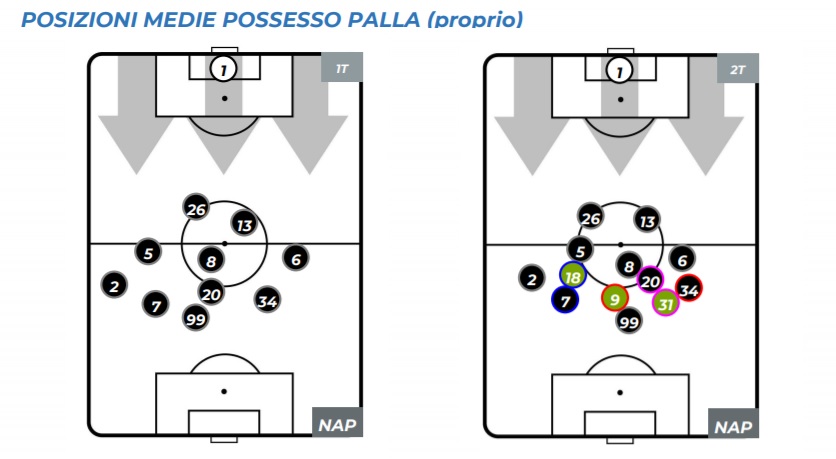 Il brasiliano s'è abbasso sulla destra e non più centralmente con Koulibaly e Luperto leggermente verso sinistra ed Allan quasi in linea per un'uscita difensiva con 3 giocatori (al punto che dalle posizioni medie, che tengono conto della zona coperta nei 90', il brasiliano è largo a destra ed il giocatore più basso dopo i centrali). In questo modo sono saltati anche i piani di Semplici della Spal, passato per la prima volta in stagione al 4-4-2 per mettersi (erroneamente) a specchio per bloccare lo scarico ai terzini e organizzare le varie pressioni a partire da quelle delle due punte sui centrali azzurri.