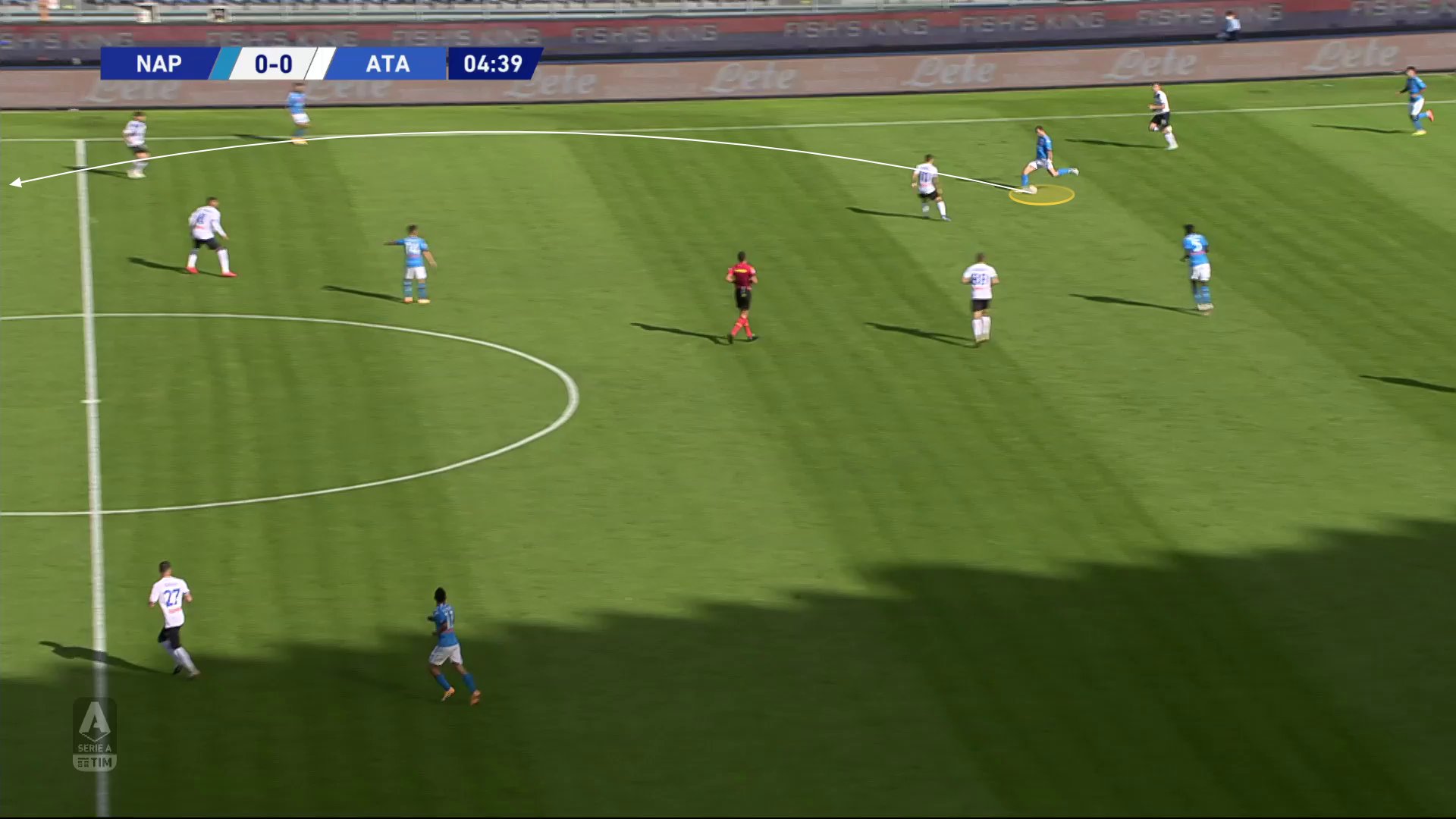 LATERALI STRETTI - Nel 4-2-3-1 l'ampiezza a sinistra è arrivata dagli attaccanti, non dal terzino (come accade da anni con Mario Rui): da qui la scelta di confermare un terzino difensivo come Hysaj. Rispetto al solito ancora più stretto perché l'Atalanta costruisce la propria fortuna con i trequartisti (in questo caso Ilicic) che arretrano per l'avanzata del centrocampista per poi mandare dentro i 'quinti' come terzo uomo tra il centrale ed il terzino avversario. Quello spazio non c'è stato: sia Hysaj che Di Lorenzo si sono stretti al centrale al loro fianco ed hanno chiuso tutte le imbucate, concedendo al limite la linea di fondo per qualche cross, il male minore