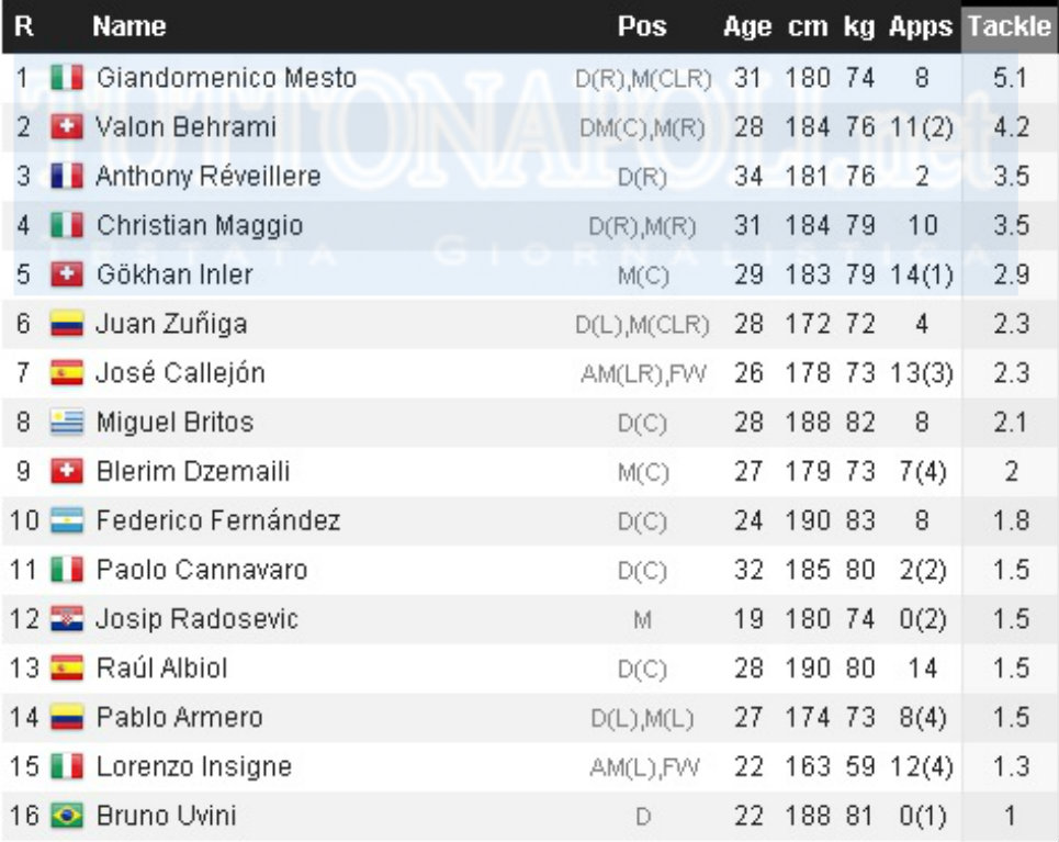 L’infortunio di Giandomenico Mesto è stato un brutto colpo per Rafa Benitez: l’ex Genoa si era ormai consolidato come una pedina fondamentale nello scacchiere dello spagnolo, ed i numeri confermano tale tesi. Come riporta la tabella che vi proponiamo, infatti, l’esterno domina la classifica dei contrasti per i calciatori azzurri: ben 5.1 a partita per 8 presenze (41 in totale) una media sorprendentemente superiore a quella di Valon Behrami (fermo a 4.2 con 54 contrasti in 13 presenze). La sua assenza ha influito non poco, quindi, sul calo di rendimento della retroguardia.