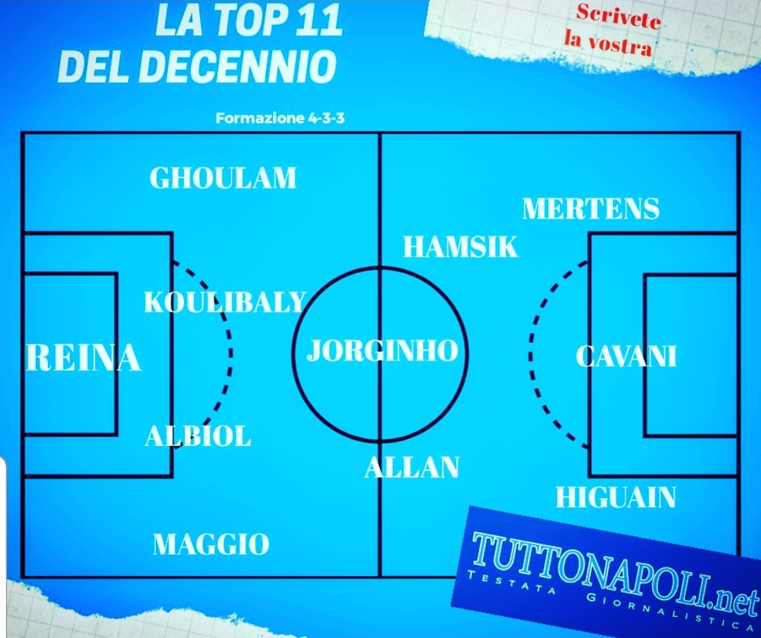 Reina - Non c'è Meret per rispetto di chi lo ha preceduto: c'è stato De Sanctis e poi è arrivato Reina, sono stati grandi entrambi, così abbiamo chiesto ai lettori di decidere, loro hanno preteso ci fosse il nome dello spagnolo in cima a questo 4-3-3 del decennio con una panchina virtualmente da brividi. Reina è stato portiere, leader, personaggio che ha diviso tifosi e critica. Ha alternato qualche errore a grandi interventi, il suo carisma lo hanno riconosciuto anche i compagni. Una fotografia: Roma-Napoli, uno a due, con suo miracolo allo scadere. Per la Panini fu la parata dell'anno.