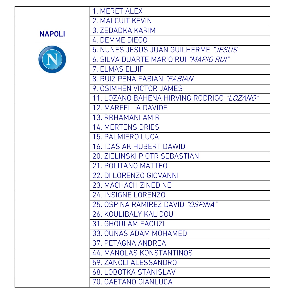 La Lega Serie A ha pubblicato i numeri di maglia comunicati dalla SSCNapoli. Non ci sono particolari cambiamenti riguardanti i big dell'organico mentre il neo-acquisto Juan Jesus prende il 5 e compaiono Gaetano col 70, Zanoli col 59, Ounas col 33, Zedadka col 3 e Machach col 23 mentre Marfella prende il 12 e Palmiero il 15. Di seguito l'elenco completo: