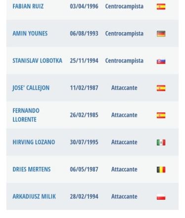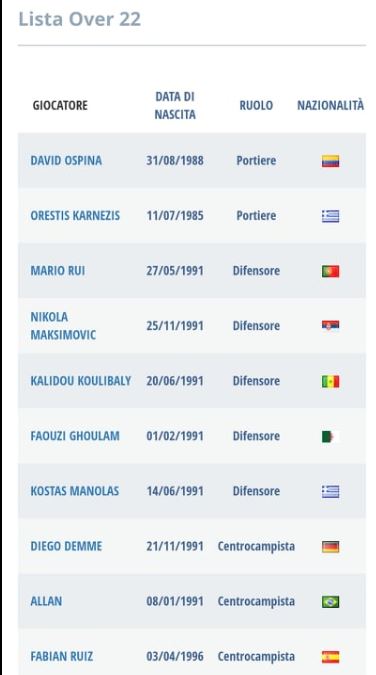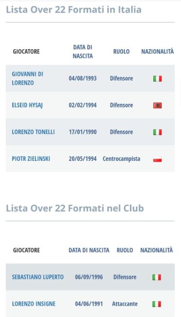 NON C'ERA POSTO - In lista, infatti, tutte le caselle sono occupate. Ne era rimasta una libera dopo il mercato estivo ed è stata appena occupata da Demme. Di seguito la lista completa composta da 23 giocatori e non da 25 dato che due posti sono stati "persi" non essendoci altri calciatori nati nel vivaio oltre a Luperto e Insigne.