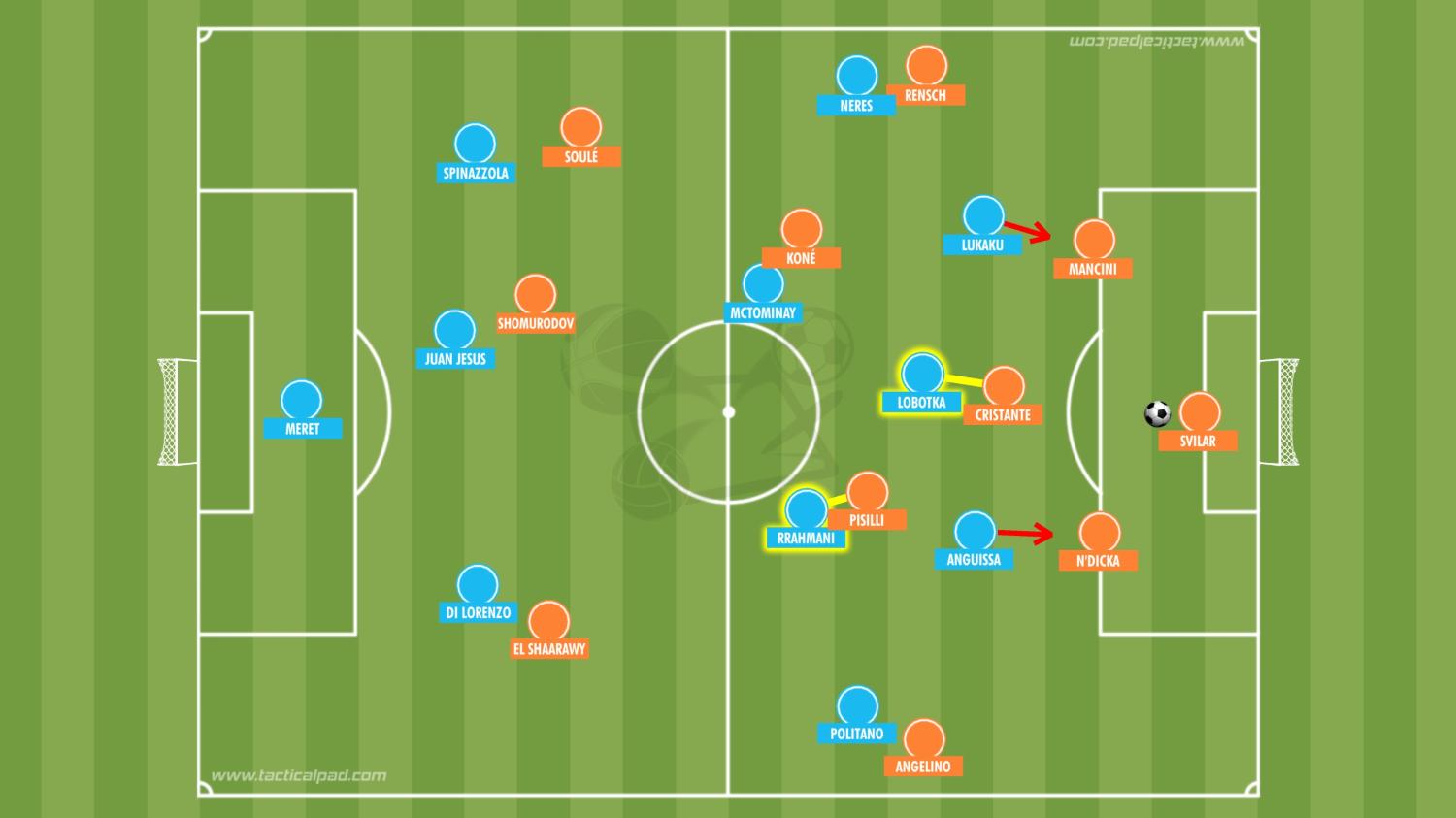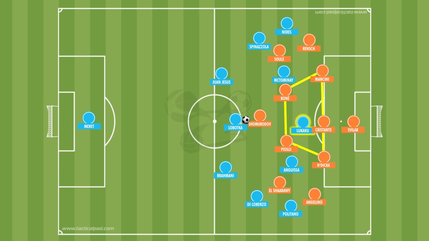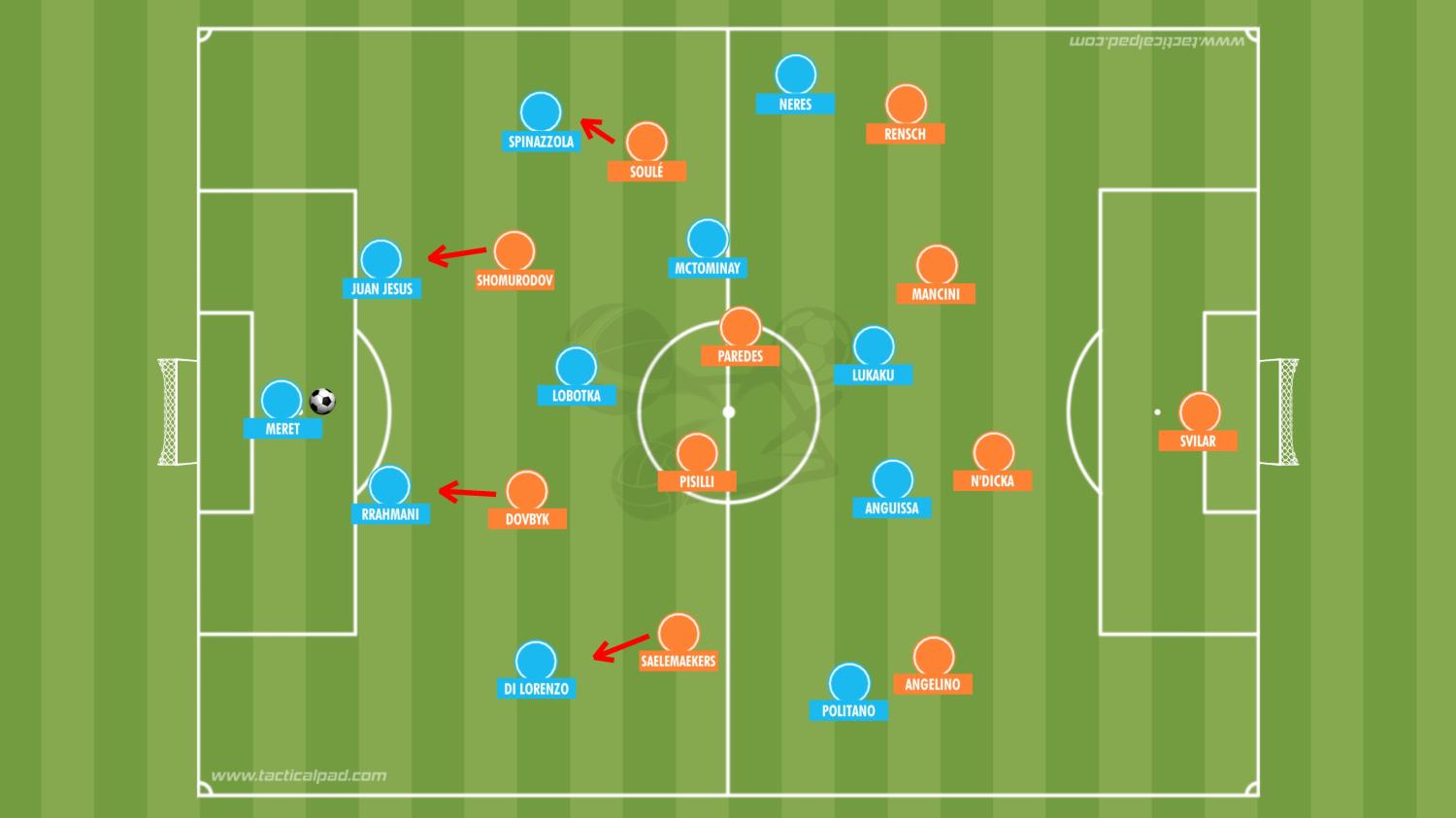 In fase difensiva, la Roma è dislocata con un 5-4-1, con Cristante che si abbassa tra i due centrali, formando così una gabbia intorno a Romelu Lukaku (vedi a fine articolo immagini num.1-2). Il belga viene escluso dal gioco: fa solo 13 tocchi in 80 minuti, peggio solo ad Empoli e a Parma (11 tocchi) dove però rimase in campo per molto meno tempo (rispettivamente 58 e 29 minuti). Il Napoli riesce comunque a sbloccare la partita trovando l’invenzione di Juan Jesus per il tocco di fino di Spinazzola; nel frattempo, la porta di Meret non è praticamente mai minacciata. Infatti gli azzurri anestetizzano la costruzione avversaria con coraggio, grazie ad un man marking a tutto campo come accaduto contro la Juventus. Contro il 2+1 della Roma (Mancini-N’Dicka + Cristante) gli accoppiamenti sono i seguenti (vedi immagini num.3-4): Lukaku e Anguissa sui due centrali, sul play stavolta ci va Lobotka e non McTominay come con la Juve, questo perché Conte vuole lo scozzese addosso a Koné. Poi terzini sugli esterni ed esterni sui terzini, dietro si accetta il 3vs3 perché Juan Jesus marca Shomurodov e Rrahmani pedina Pisilli fin dentro la sua area.
