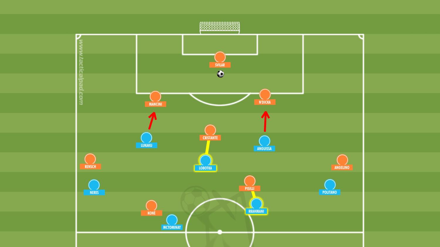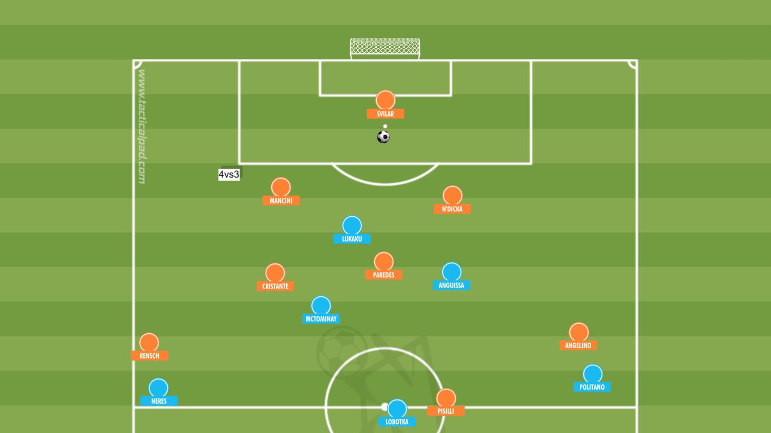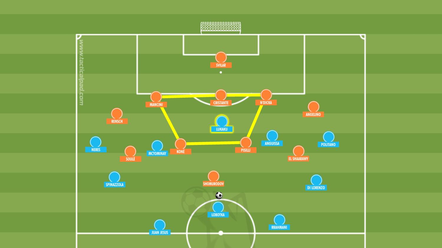 In fase difensiva, la Roma è dislocata con un 5-4-1, con Cristante che si abbassa tra i due centrali, formando così una gabbia intorno a Romelu Lukaku (vedi a fine articolo immagini num.1-2). Il belga viene escluso dal gioco: fa solo 13 tocchi in 80 minuti, peggio solo ad Empoli e a Parma (11 tocchi) dove però rimase in campo per molto meno tempo (rispettivamente 58 e 29 minuti). Il Napoli riesce comunque a sbloccare la partita trovando l’invenzione di Juan Jesus per il tocco di fino di Spinazzola; nel frattempo, la porta di Meret non è praticamente mai minacciata. Infatti gli azzurri anestetizzano la costruzione avversaria con coraggio, grazie ad un man marking a tutto campo come accaduto contro la Juventus. Contro il 2+1 della Roma (Mancini-N’Dicka + Cristante) gli accoppiamenti sono i seguenti (vedi immagini num.3-4): Lukaku e Anguissa sui due centrali, sul play stavolta ci va Lobotka e non McTominay come con la Juve, questo perché Conte vuole lo scozzese addosso a Koné. Poi terzini sugli esterni ed esterni sui terzini, dietro si accetta il 3vs3 perché Juan Jesus marca Shomurodov e Rrahmani pedina Pisilli fin dentro la sua area.