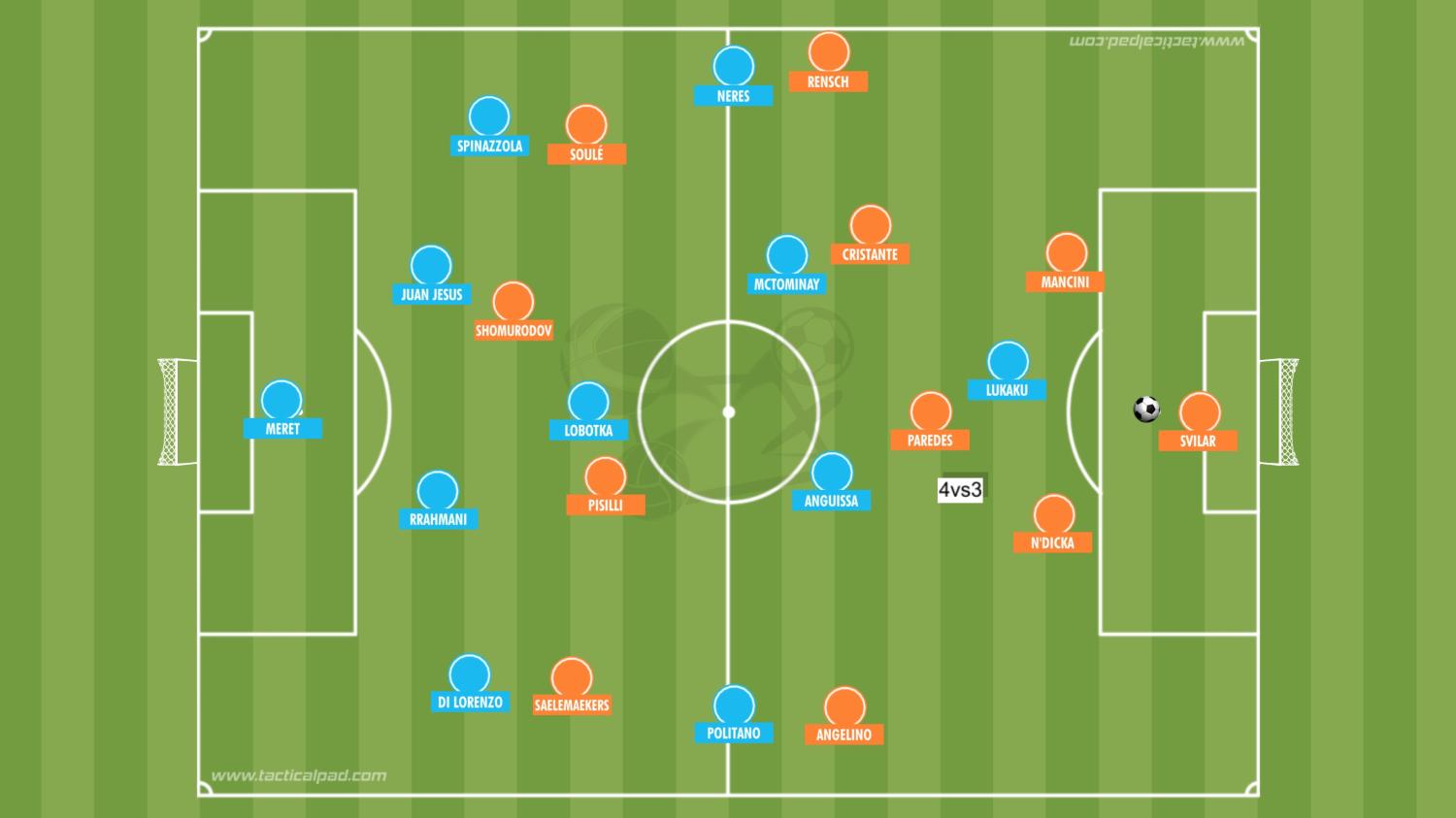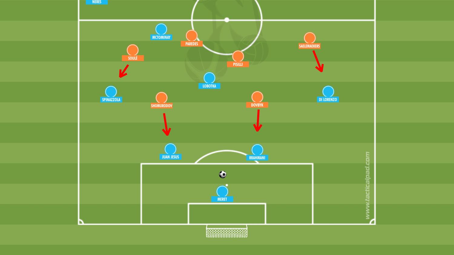 Nella ripresa con il risultato a favore accade che il Napoli lascia il possesso palla alla Roma per lunghi tratti di gioco. Rinunciatario per qualcuno, stanco secondo altri. Ciò che di certo si verifica è la qualità degli ingressi giallorossi che schiaccia gli azzurri nella propria trequarti. Rispetto al primo tempo, Lobotka spesso lascia Pisilli e la prima pressione è in inferiorità numerica (vedi immagini num.5-6). Il tecnico esperto fiuta la buona possibilità e inserisce i suoi uomini migliori, indicando di pressare alto: ora il pressing è in parità numerica con Shomurodov e Dovbyk su Rrahmani e Juan Jesus, Soulé prende Spinazzola e Saelemaekers Di Lorenzo, mentre Pisilli e Paredes hanno il compito di schermare Lobotka e McTominay. Il Napoli allora deve affidarsi alla soluzione lunga, prova infatti 62 passaggi lunghi contro i 46 della Roma, ma non sempre riesce a consolidare il possesso.